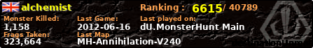 alchemist | | PlayerID: | 9213 | | Overall MHT: | 323,664 | | Overall Deaths: | 87 | | Overall Suicides: | 10 | | Overall TeamKills: | 2 | | Overall Distance traveled: | 54km | | Overall Time Spend on Server: | 00days 04h 13m 45s | | Maps Played: | 25 | | Firstgame: | 2012-04-19 22:05:07 | | LastGame: | 2012-06-16 00:25:24 | | Player Ranking Place: | 6615 | | Used Playernames: | alchemist [ENG]Alchemist Man-City.SUCKS CarlosNexus