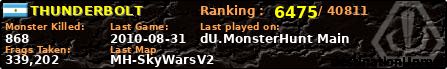 | Server | Map | LastGame | Score | Teamscore | Monsterleft | Deaths | Suicides | TKs | Distance | Playtime | |